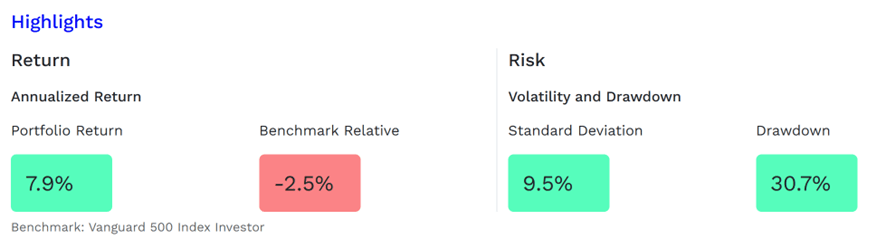 Ecco qui i primi dati di sintesi che ci fanno capire l’andamento. CAGR, ossia tasso di interesse composto, pari a 7.9%, deviazione standard (che misura la volatilità) del 9,5% e un calo massimo del 30,7%. Forse visti così, senza ulteriore contestualizzazione, questi numeri non ti dicono molto. Per cui ti anticipo io che sono di tutto rispetto.