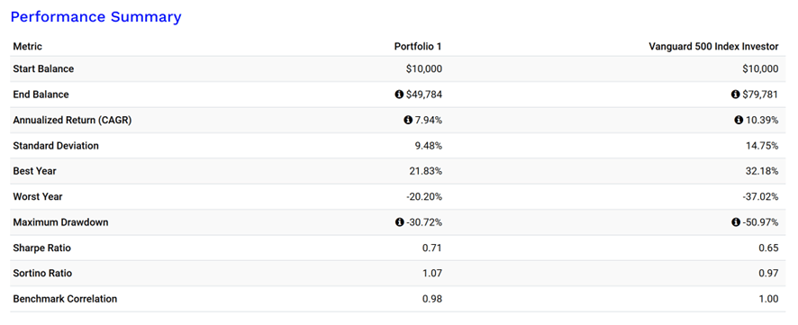 Il nostro portafoglio alla fine dei 20 anni ti fa ottenere 49.784 dollari mentre l’indice azionario di riferimento (S&P 500) ti avrebbe permesso di incassare addirittura 79.781 dollari. Quasi 5 volte la cifra iniziale, contro quasi 8 volte. Il che corrisponde ad un CAGR del 7,9% in un caso e del 10,39% in un altro. Stiamo parlando di 30.000 dollari ca. di differenza. Non c’è dubbio, quindi, che, se guardiamo al rendimento assoluto, il mercato azionario ha sovraperformato di parecchio. Ma cambiamo il punto di vista e verifichiamo anche le altre metriche.