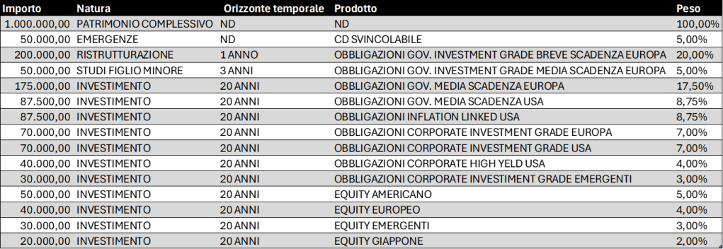 Partiamo dagli imprevisti. Come abbiamo già detto, le esigenze conosciute sono solo una parte, più o meno grande, di quelle reali. Capita spesso che qualcosa di inaspettato sopraggiunga a rovinare i piani. E allora, per quanto possibile, sempre meglio essere pronti. Nella tua situazione, può essere ragionevole creare una riserva che corrisponda a sei mese di spese: 50.000 euro sono una cifra congrua. Poi c’è la ristrutturazione. Alla luce degli interventi desiderati, fai una stima prudenziale di 200.000 euro. Infine, il tuo caro figlio minore; nel dubbio di cosa vorrà scegliere e per mantenergli aperte diverse possibilità, pensi che sia opportuno accantonare altri 50.000 euro. Tutto il resto, molto intelligentemente, decidi di investirlo per… investire. E fino all’ultimo centesimo. Andiamo allora dritti al punto e scopriamo quale potrebbe essere un portafoglio adatto alla tue esigenze: