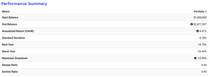 Il valore assoluto del portafoglio raggiunge quasi una volta e mezza quello iniziale grazie ad un tasso di interesso composto medio annuo del 4,41 %. La volatilità media incontrata lungo il percorso, invece, è del 4,78%, con un drawdown massimo del 13,90%. Sharpe ratio dello 0,64.