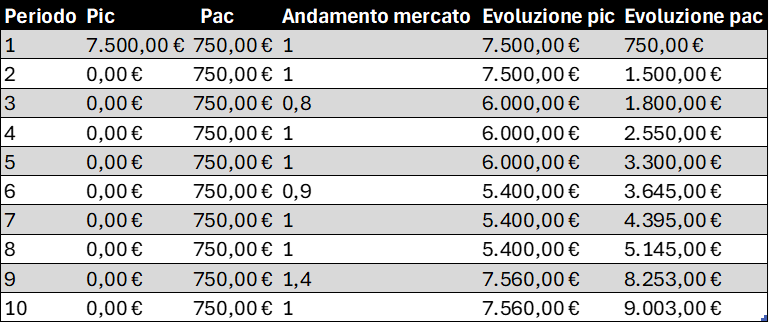 Ecco i tuoi 7.500 euro investiti tutti in una sola volta con un PIC, oppure in 10 rate mensili con un PAC. Nella quarta colonna i movimenti delle quotazioni (sono fattorizzati): +40% nel terzo mese (ti piacerebbe…), -10% nel sesto e -20% nel nono (e infatti… era troppo bello per essere vero). Chi vince? Il PIC e con uno scarto di ben 1.000 euro. La scelta migliore in questo caso quindi è evidente. Ma cosa succederebbe se invertissimo l’andamento del mercato?